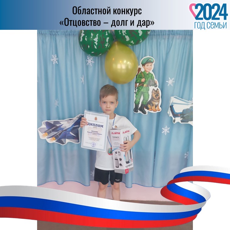 Семья Толокнова Марка и Ватагина Семена награждены Дипломами участников областного конкурса "Отцовство - долг и дар" в номинации "Папа - патриот" и памятными подарками.